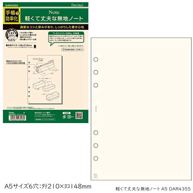 商品名 Davinci ダ・ヴィンチ A5サイズ システム手帳 リフィル軽くて丈夫な無地ノート A5 品番 DAR4355 サイズ 横148×縦210mm (A5サイズ、デスクサイズ 6穴) 入数 20枚入 仕様 厚みのあるトモエリバー68Nの専用リフィル 素材原材料:紙(トモエリバー), 生産国:日本 メーカー 株式会社 レイメイ藤井 ※A5サイズのリフィルですサイズ違いには十分ご注意ください。